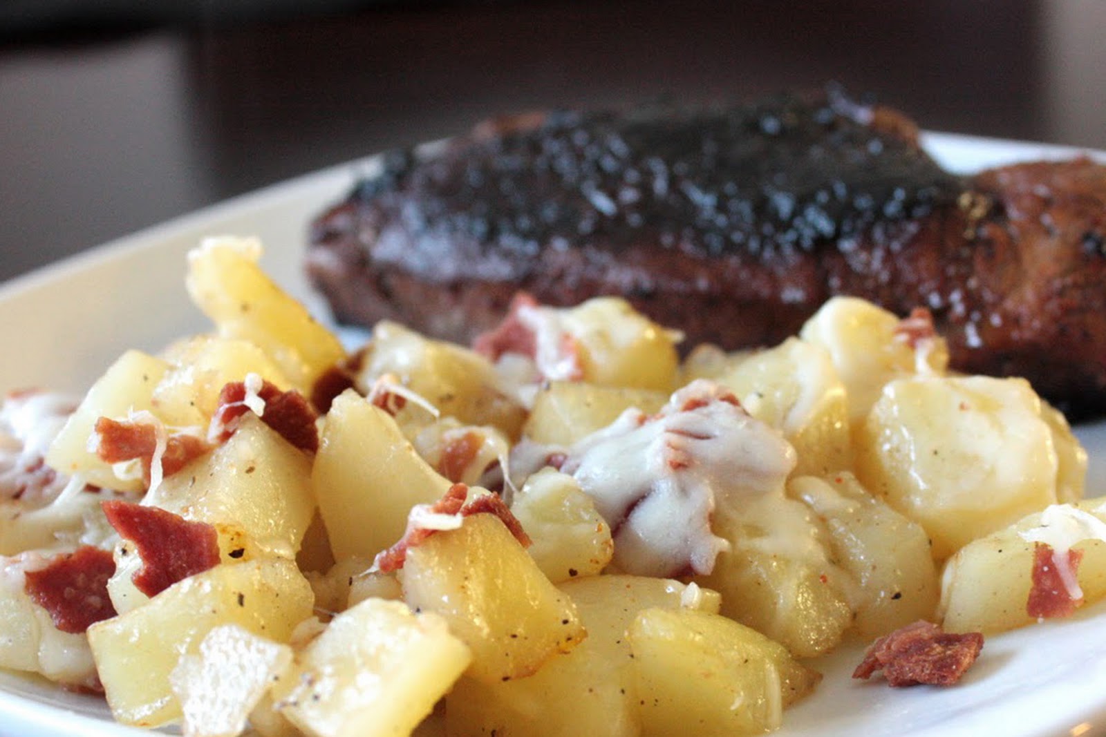 Spray a baking sheet well with cooking spray. Spread potatoes onto baking sheet in one layer. Bake for 15 minutes. Top with cheese and bacon and return to oven until cheese is melted.